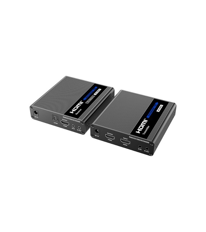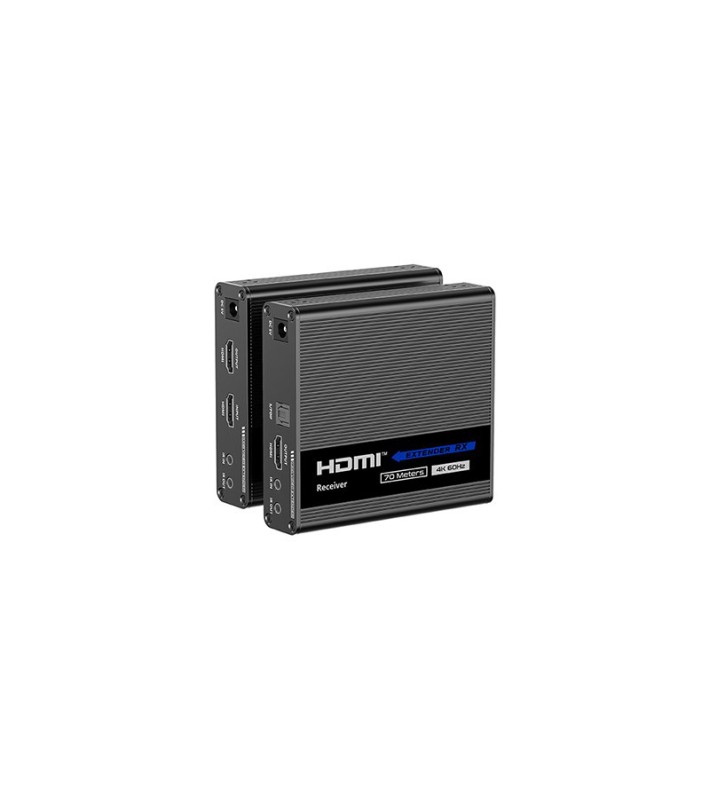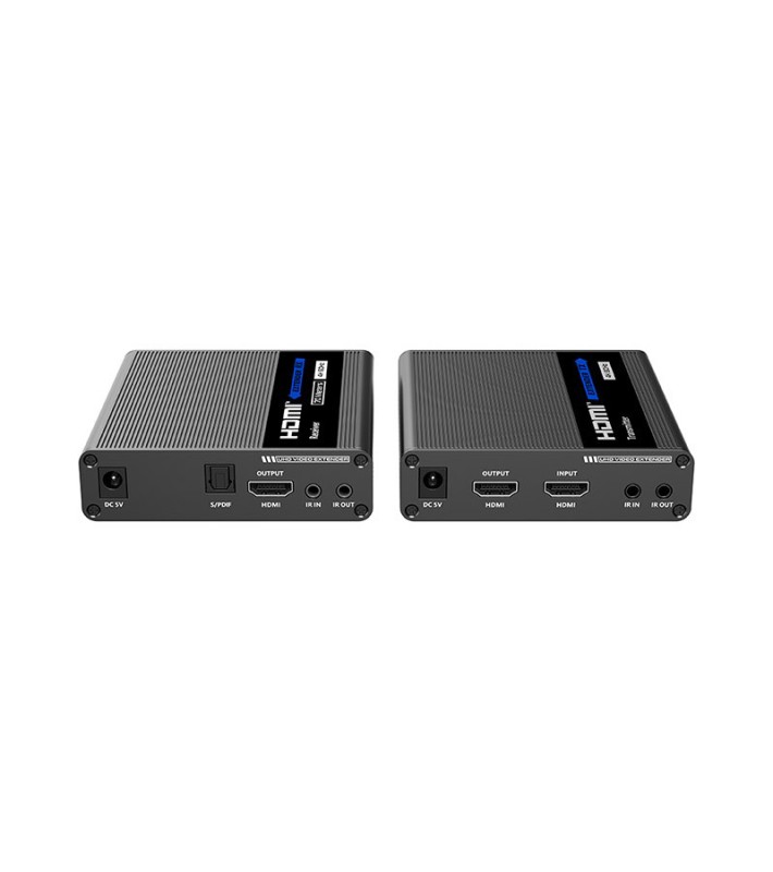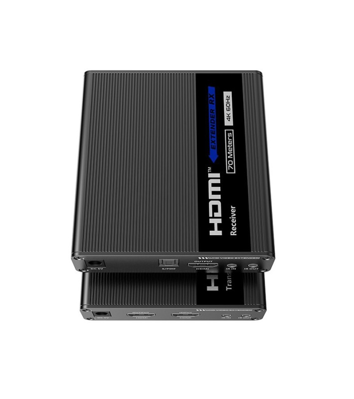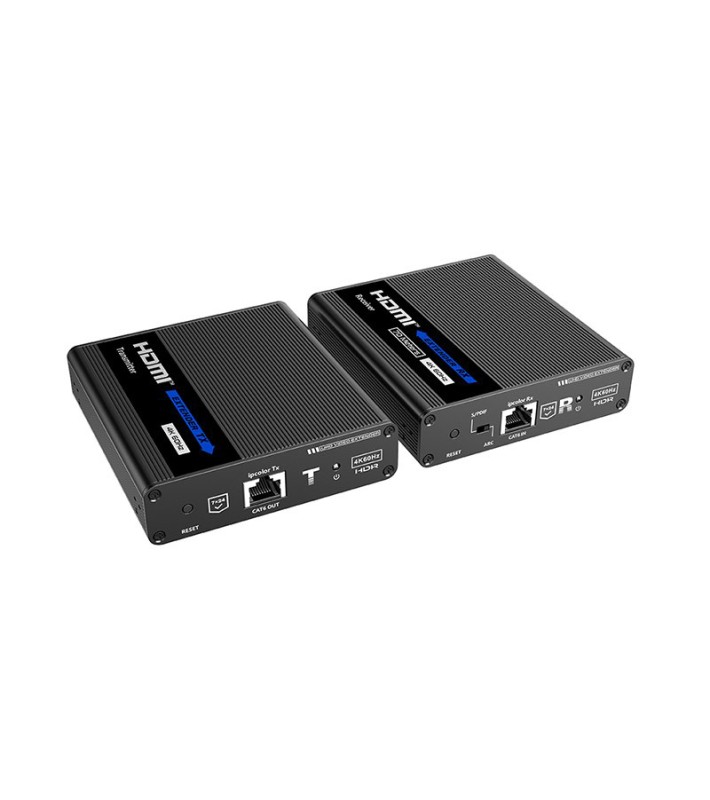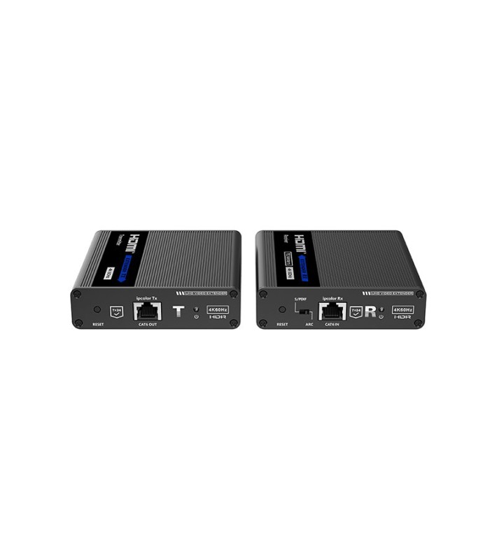 Αρχεία για τo Προϊόν Κορυφαίο σύστημα (πομπός + δέκτης) IPCOLOR για μετάδοση σήματος HDMI 2.0, 4K UHD, από τον πομπό προς το δέκτη (point to point), μέσω 1 καλωδίου δικτύου Cat6 / 6A / 7, σε απόσταση έως και 70m, με μηδενική καθυστέρηση (zero latency), μετάδοση εντολών από τηλεχειριστήρια υπερύθρων προς 2 κατευθύνσεις (bidirectional IR pass-back, από τον δέκτη προς τον πομπό ή αντίστροφα), έξοδο HDMI loop through στον πομπό (δεν απαιτείται χωριστό HDMI splitter για την οδήγηση τοπικού monitor), ψηφιακή έξοδος ήχου S/PDIF στον δέκτη (για την οδήγηση ενισχυτών και ηχείων) με διακόπτη επιλογής της πηγής (από το σήμα HDMI του πομπού ή από HDMI ARC, το σήμα επιστροφής από το HDMI της τηλεόρασης που συνδέεται στο δέκτη), φωτεινές ενδείξεις LED για τροφοδοσία / σύνδεση HDMI, μπουτόν reset, προστασία από υπερτάσεις (lightning / surge / ESD), μεταλλικό περίβλημα κράματος αλουμινίου. Υποστήριξη 4K@60Hz, HDCP 2.2, HDMI 2.0, HDR, YUV4:4:4, EDID pass-through με αυτόματη προσαρμογή στην ποιότητα του καλωδίου για τη βελτιστοποίηση της εικόνας, audio formats LPCM / DTS-HD / DTS-Audiο / Dolby Digital 5.1CH. Περιλαμβάνονται 2 τροφοδοτικά 230 VAC / 5 VDC, δέκτης IR με καλώδιο, πομπός IR με καλώδιο και βάσεις στήριξης.
