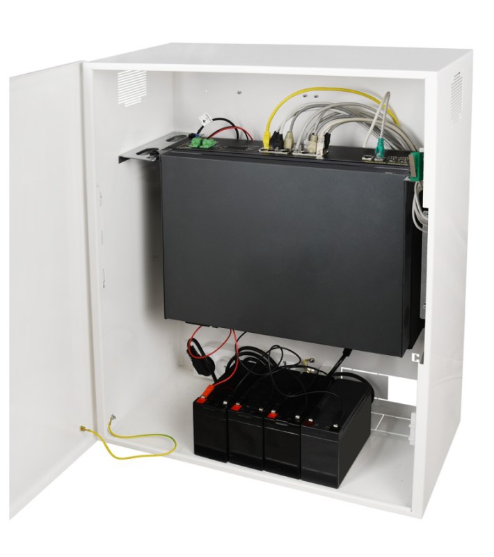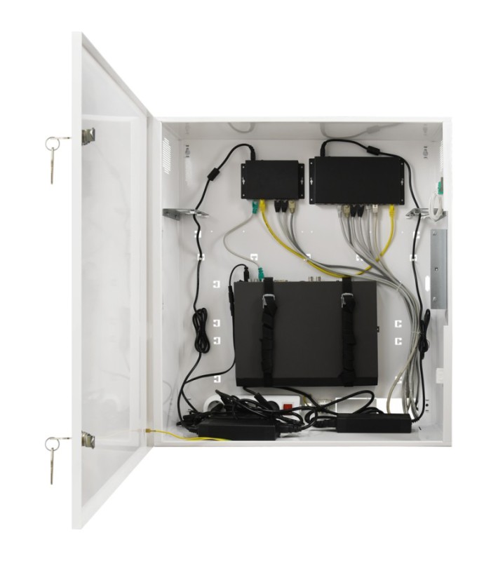 Μεταλλικό ερμάριο LARGE κάθετης τοποθέτησης σε τοίχο, συμβατό με GDPR, για την προστασία καταγραφικού από μη εξουσιοδοτημένη πρόσβαση ή από κλοπή. Το καταγραφικό στερεώνεται με ιμάντες στη βάση, υπάρχει βάση για monitor ως 22’’, ενώ μπορεί να τοποθετηθεί και Ethernet switch, τροφοδοτικό, πoλύπριζο, ανεμιστήρας με θερμοστάτη ARAW45 ή ακόμη και συσκευή σε rack ως 4U. Είναι κατασκευασμένο από φύλο χάλυβα 1.2 mm, διαθέτει διπλές κλειδαριές και tamper. Εξωτερικές διαστάσεις (ΠxBxY) 590x(281+14)x650 mm.