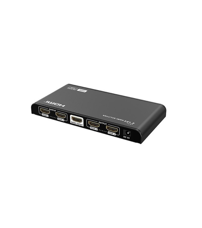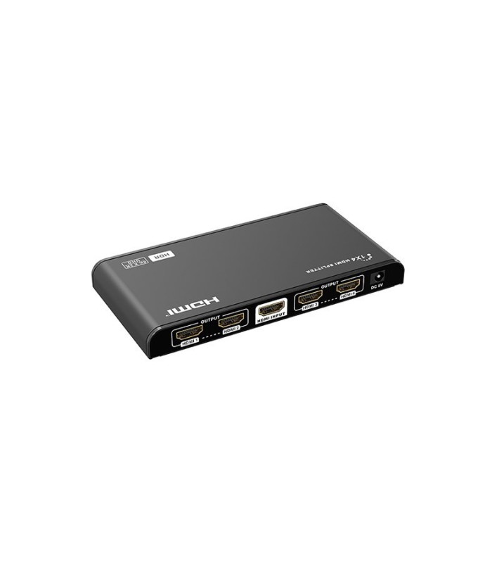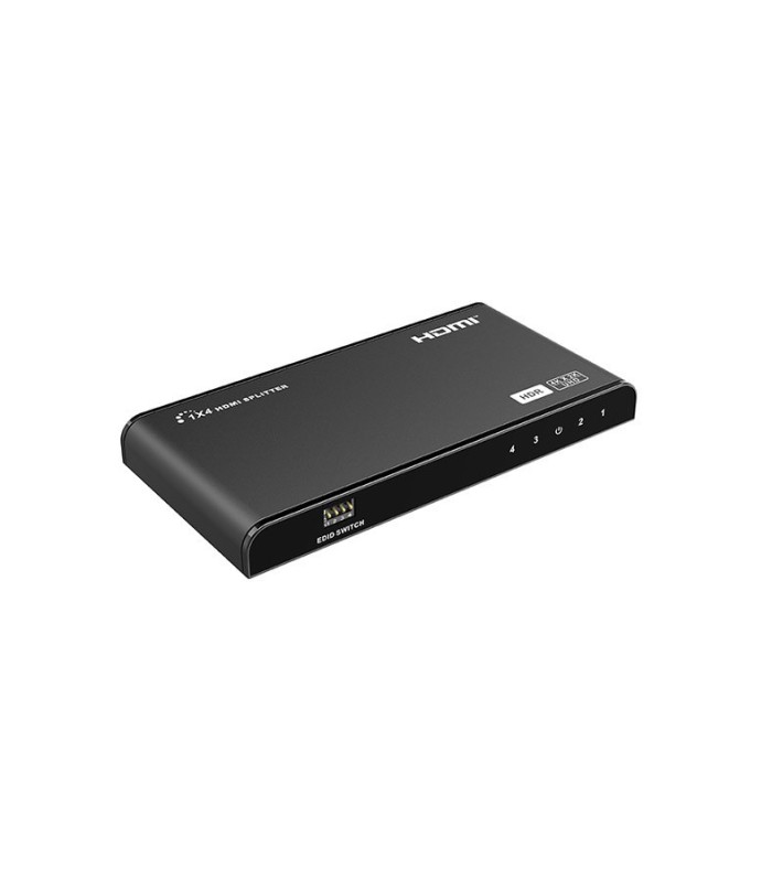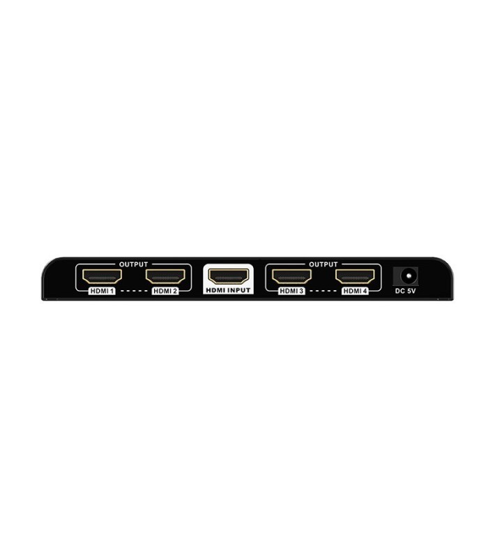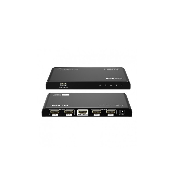 Διανομέας (video splitter) 1 εισόδου HDMI σε 4 εξόδους HDMI, ανάλυσης ως Ultra HD 4Κx2K@60Hz, με υποστήριξη HDCP 2.2, HDMI 2.0, HDR, YUV4:4:4, 3D HDMI, standard audio / DSD (Direct Stream Digital) audio / HD (HBR) audio, αυτόματη επιλογή της υψηλότερης δυνατής ανάλυσης για κάθε έξοδο χωριστά, ανάλογα με τα χαρακτηριστικά του συνδεδεμένου monitor (π.χ. είσοδος 4K, 1η έξοδος 4Κ, 2η έξοδος 1080p, κ.λ.π.), επιλογή EDID για κάθε έξοδο χωριστά, μεταξύ 16 αναλύσεων / προτύπων εικόνας / ήχου και down scaling, φωτεινές ενδείξεις LED για τροφοδοσία και κάθε κανάλι εξόδου. Περιλαμβάνεται τροφοδοτικό 230 VAC / 5 VDC.