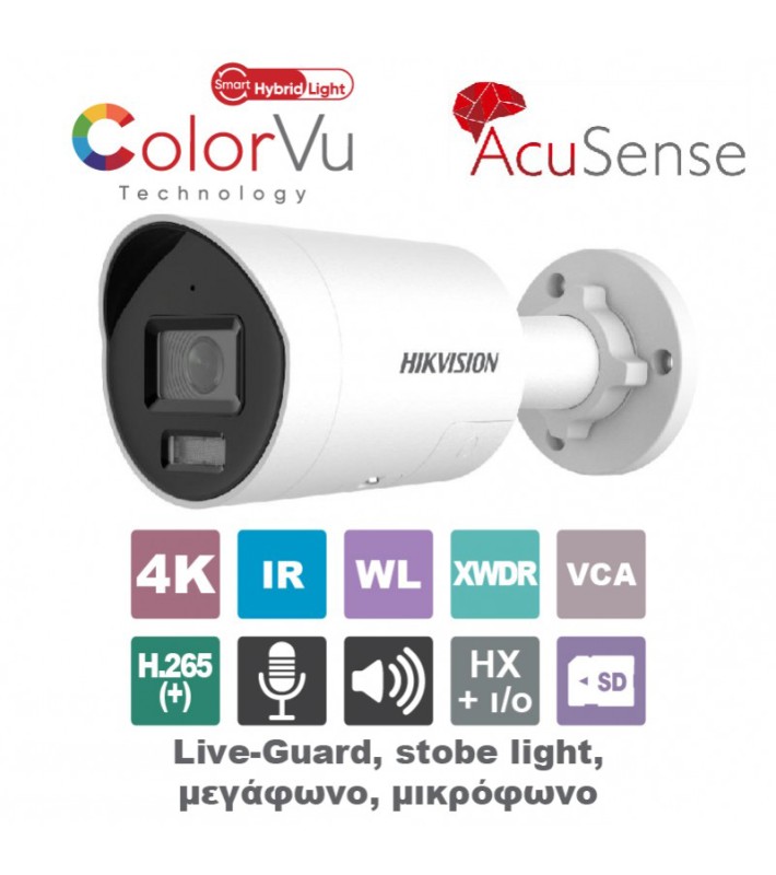 Δικτυακή κάμερα Bullet 8MP (4K) Smart Hybrid Light ColorVu Live-Guard, μεγάλο αισθητήριο 1/1.8ʺ, σταθερός ευρυγώνιος φακός confocal 2.8mm (γωνία θέασης 104°) υψηλής φωτεινότητας F1.0, λευκός και υπέρυθρος φωτισμός εμβέλειας ως 40 m με επιλεγόμενη λειτουργία (έγχρωμη εικόνα ημέρα - νύχτα / IR μόνο / smart: IR + λευκό φωτισμό σε συναγερμό), εξαιρετικά υψηλή ευαισθησία 0.0008 Lux @ (F1.0, AGC ON) / 0 Lux with light, 130dB WDR, 3D DNR, BLC, HLC, H.265+, ROI, VCA analytics with human and vehicle target classification line crossing / intrusion / region entrance / region exiting / scene change / face capture / Motion Detection 2.0, ενσωματωμένο μικρόφωνο, δυνατότητα σήμανσης συναγερμού με λευκό φωτισμό που αναβοσβήνει και αναπαραγωγή ηχητικών μηνυμάτων *.wav από ενσωματωμένο μεγάφωνο 1.2 W 95dB, υποδοχή κάρτας Micro SD/SDHC/ SDXC ως 512 GB για τοπική καταγραφή video, βαθμός στεγανότητας IP67, τροφοδοσία PoE ή 12 VDC, κατανάλωση 8.5 W / 10 W (PoE), (διάμετρος x μήκος) 74.4×179.2 mm. Συνδυάζεται με βάσεις: DS-1280ZJ-XS.