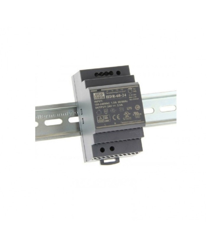 Τροφοδοτικό 60W για τοποθέτηση σε ράγα DIN, με ρυθμιζόμενη τάση εξόδου 21.6 ~ 29 VDC (ονομαστική 24 VDC) @ 2.5A max, είσοδος 85~264VAC, isolation class II, typical efficiency 90%, short circuit, overload & overvoltage protection, -30 ~+70°C, (Π×Β×Υ) 52.5×54.5×90 mm.