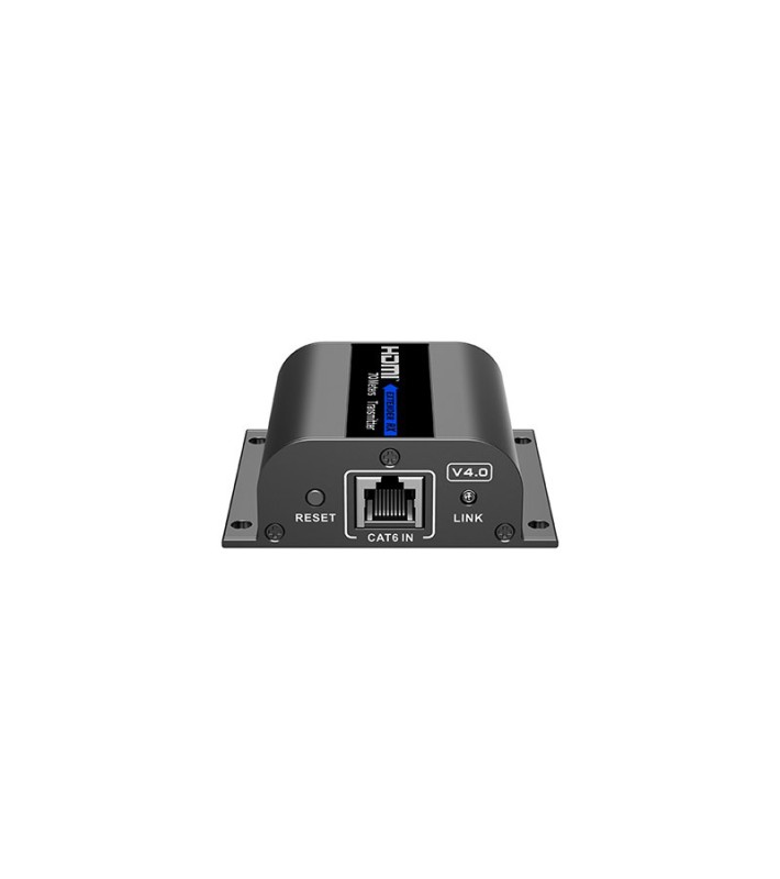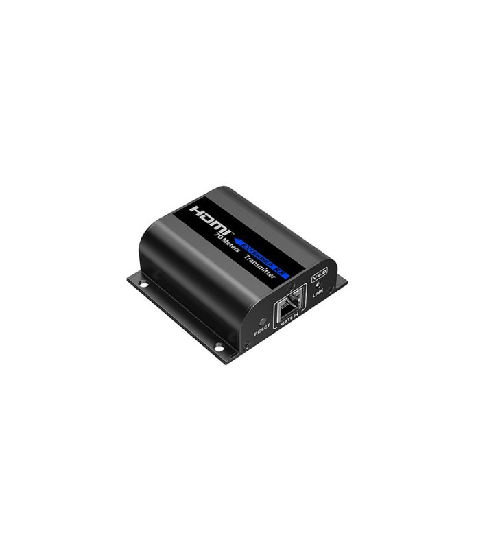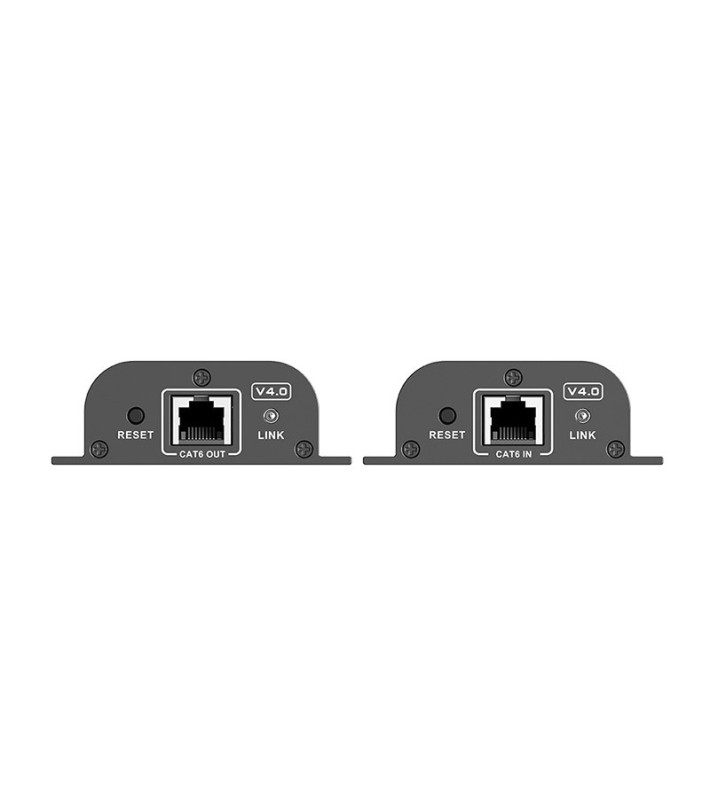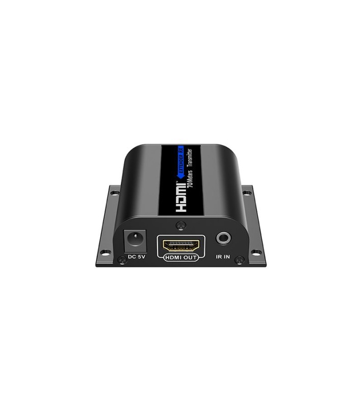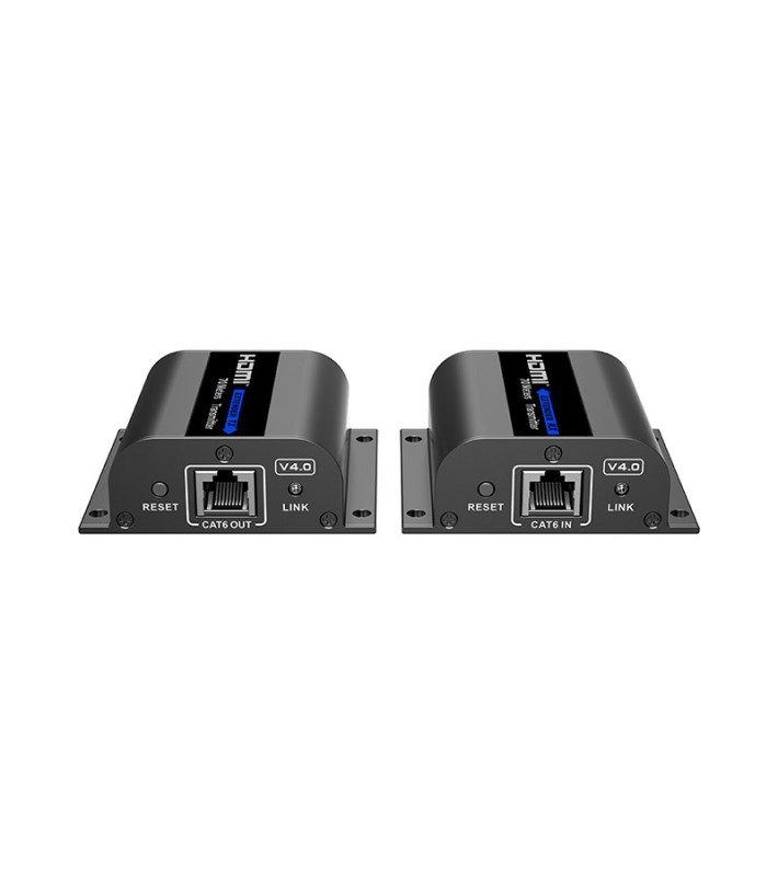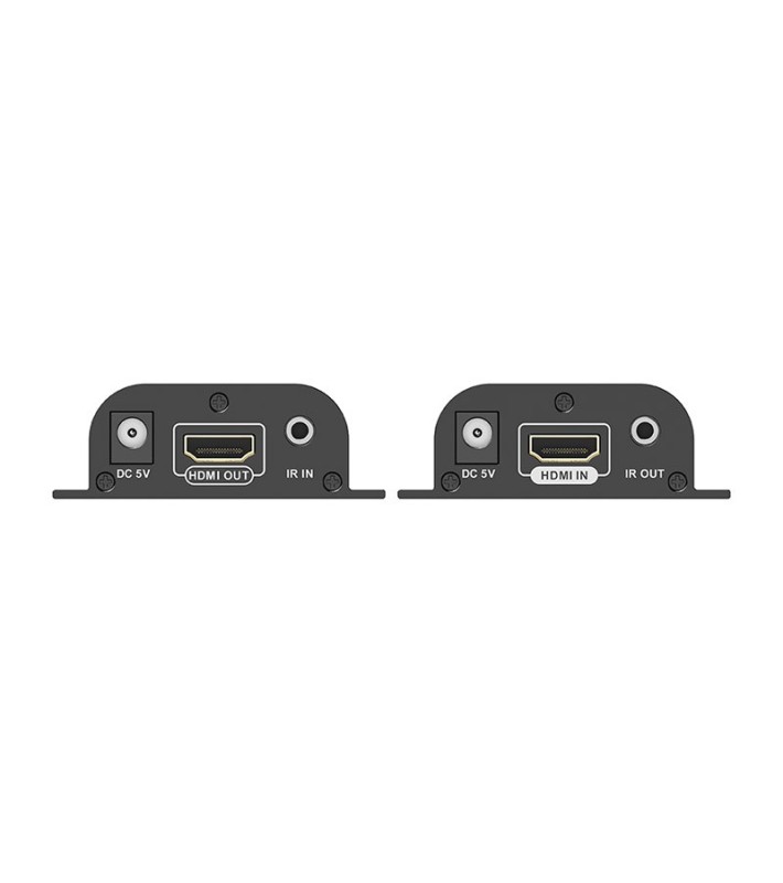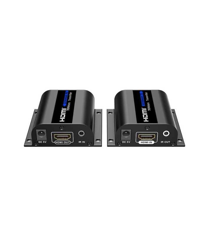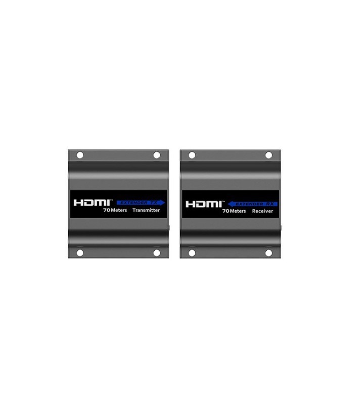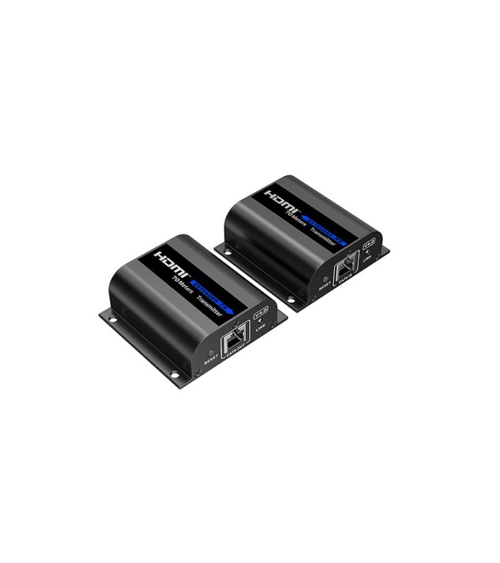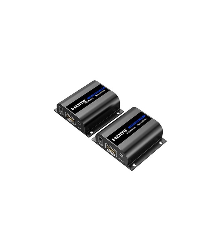 Αρχεία για τo Προϊόν Σύστημα (πομπός + δέκτης) για μετάδοση σήματος HDMI 1080p, από τον πομπό προς το δέκτη (point to point), μέσω 1 καλωδίου δικτύου Cat5e / 6 / 6A / 7, σε απόσταση έως και 70m, με μηδενική καθυστέρηση (zero latency), μετάδοση εντολών από τηλεχειριστήρια υπερύθρων (IR pass-back) από τον δέκτη προς τον πομπό, φωτεινές ενδείξεις LED για τροφοδοσία / σύνδεση HDMI, μπουτόν reset, προστασία από υπερτάσεις (lightning / surge / ESD), μεταλλικό περίβλημα με ενσωματωμένες γωνίες για προσαρμογή σε rack ή επίτοιχη τοποθέτηση. Υποστήριξη 1080p@60Hz, HDCP 1.4, HDMI 1.3, HDR10, YUV4:4:4, EDID pass-through με αυτόματη προσαρμογή στην ποιότητα του καλωδίου για τη βελτιστοποίηση της εικόνας, audio formats PCM / LPCM / DTS HD / DTS Audio. Περιλαμβάνονται 2 τροφοδοτικά 230 VAC / 5 VDC, δέκτης IR με καλώδιο και πομπός IR με καλώδιο.