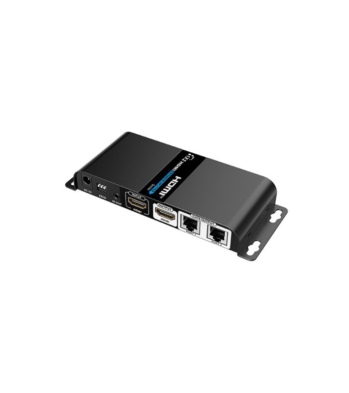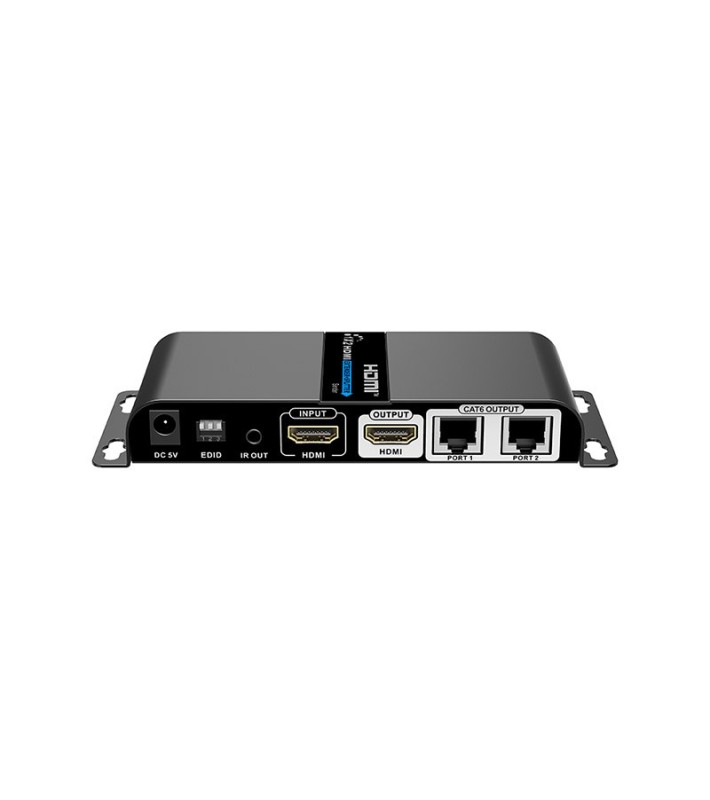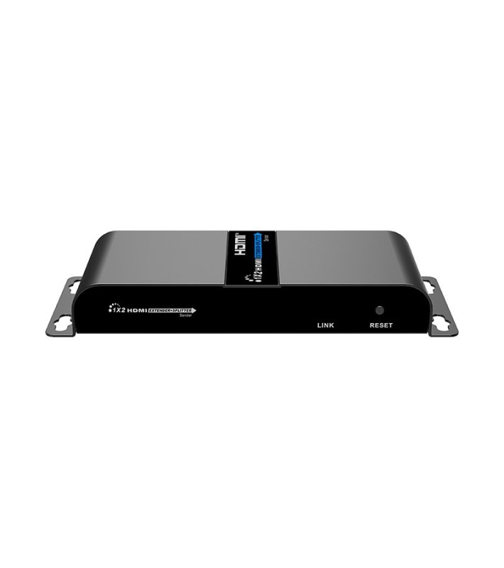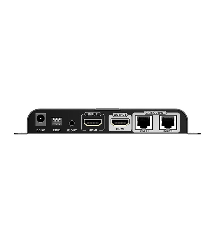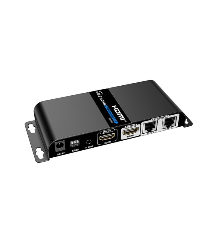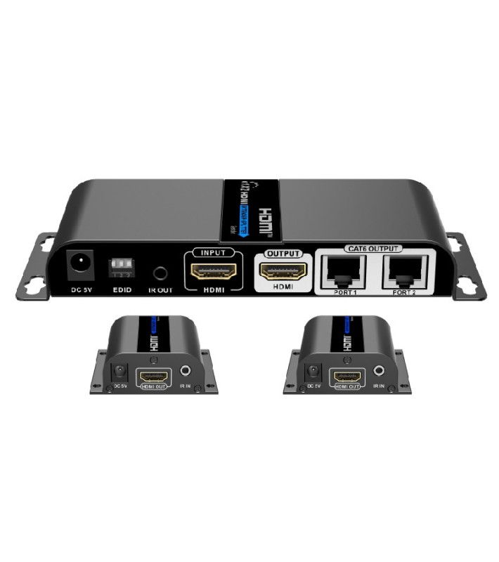 Σύστημα 1 x 2 HDMI splitter & extender (1 πομπός + 2 δέκτες) για μετάδοση σήματος HDMI 1080p, από τον πομπό προς κάθε δέκτη, μέσω 1 καλωδίου δικτύου Cat5e / 6 / 6A / 7, σε απόσταση έως και 40m, με μηδενική καθυστέρηση (zero latency), μετάδοση εντολών από τηλεχειριστήρια υπερύθρων (IR pass-back) από τους δέκτες προς τον πομπό, έξοδο HDMI loop through στον πομπό (δεν απαιτείται χωριστό HDMI splitter για την οδήγηση τοπικού monitor), φωτεινές ενδείξεις LED για τροφοδοσία / σύνδεση HDMI, μπουτόν reset, προστασία από υπερτάσεις (lightning / surge / ESD), τροφοδοσία δεκτών από τον πομπό μέσω του ίδιου UTP καλωδίου (δεν χρειάζονται τροφοδοτικά στους πομπούς), μεταλλικό περίβλημα με ενσωματωμένες γωνίες για προσαρμογή σε rack ή επίτοιχη τοποθέτηση. Υποστήριξη 1080p@60Hz, HDCP 1.2, HDMI 1.3, επιλογή EDID για προσαρμογή στην ποιότητα του καλωδίου και τη βελτιστοποίηση της εικόνας. Περιλαμβάνονται 1 τροφοδοτικό 230 VAC / 5 VDC για τον πομπό, 2 δέκτες IR με καλώδιο και 1 πομπός IR με καλώδιο.
