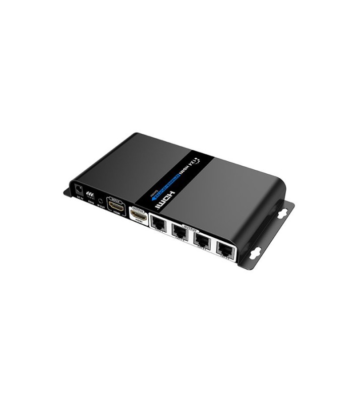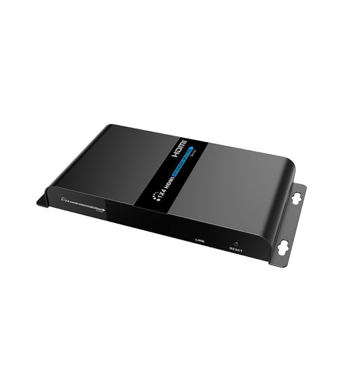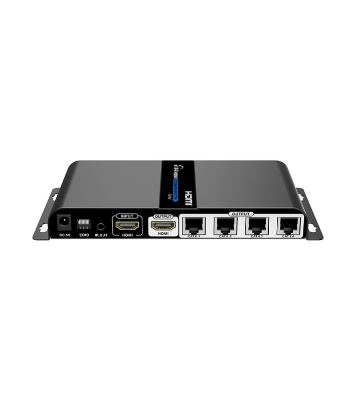 Σύστημα 1 x 4 HDMI splitter & extender (1 πομπός + 4 δέκτες) για μετάδοση σήματος HDMI 1080p, από τον πομπό προς κάθε δέκτη, μέσω 1 καλωδίου δικτύου Cat5e / 6 / 6A / 7, σε απόσταση έως και 40m, με μηδενική καθυστέρηση (zero latency), μετάδοση εντολών από τηλεχειριστήρια υπερύθρων (IR pass-back) από τους δέκτες προς τον πομπό, έξοδο HDMI loop through στον πομπό (δεν απαιτείται χωριστό HDMI splitter για την οδήγηση τοπικού monitor), φωτεινές ενδείξεις LED για τροφοδοσία / σύνδεση HDMI, μπουτόν reset, προστασία από υπερτάσεις (lightning / surge / ESD), τροφοδοσία δεκτών από τον πομπό μέσω του ίδιου UTP καλωδίου (δεν χρειάζονται τροφοδοτικά στους πομπούς), μεταλλικό περίβλημα με ενσωματωμένες γωνίες για προσαρμογή σε rack ή επίτοιχη τοποθέτηση. Υποστήριξη 1080p@60Hz, HDCP 1.2, HDMI 1.3, επιλογή EDID για προσαρμογή στην ποιότητα του καλωδίου και τη βελτιστοποίηση της εικόνας. Περιλαμβάνονται 1 τροφοδοτικό 230 VAC / 5 VDC για τον πομπό, 4 δέκτες IR με καλώδιο και 1 πομπός IR με καλώδιο.